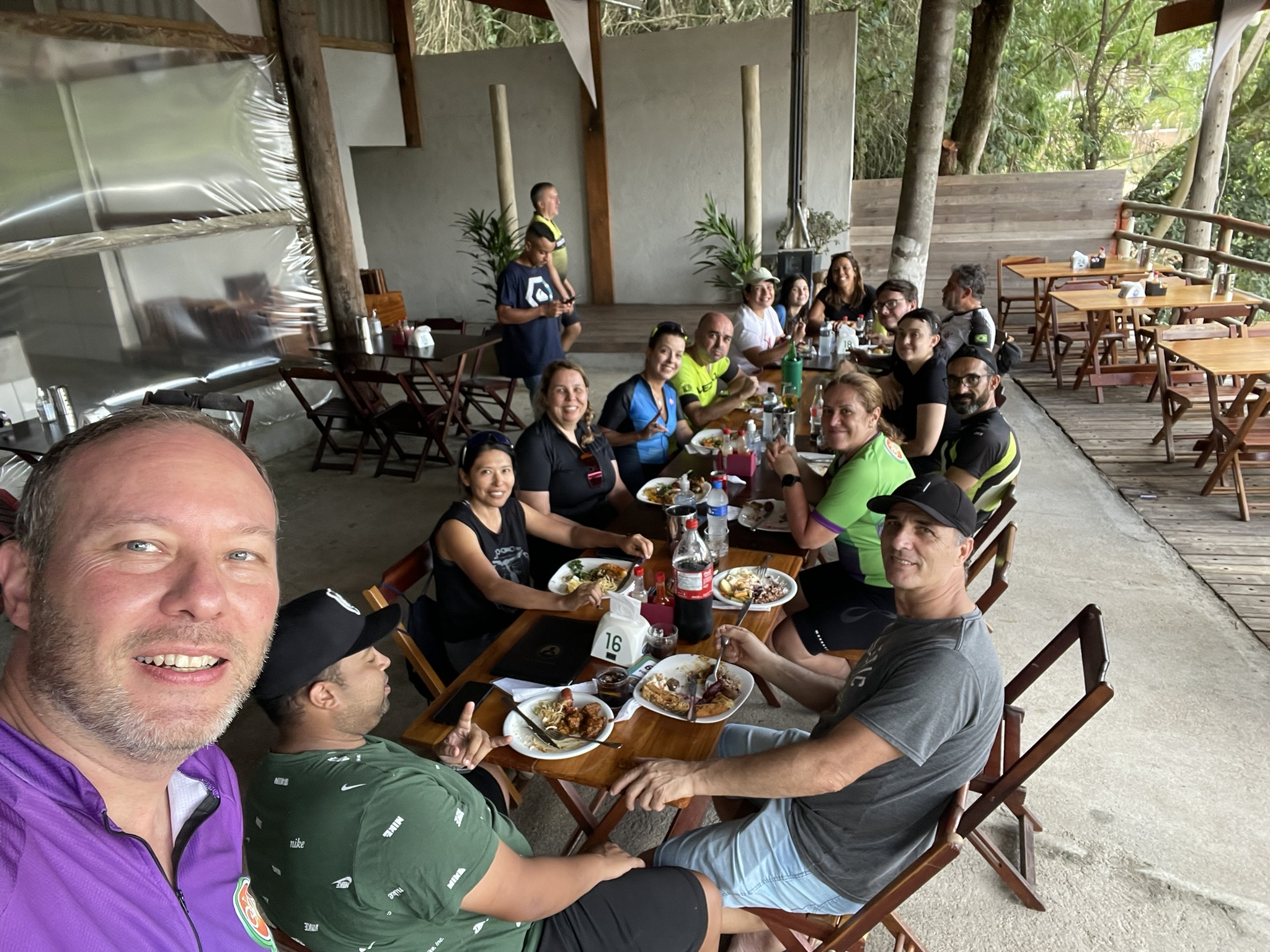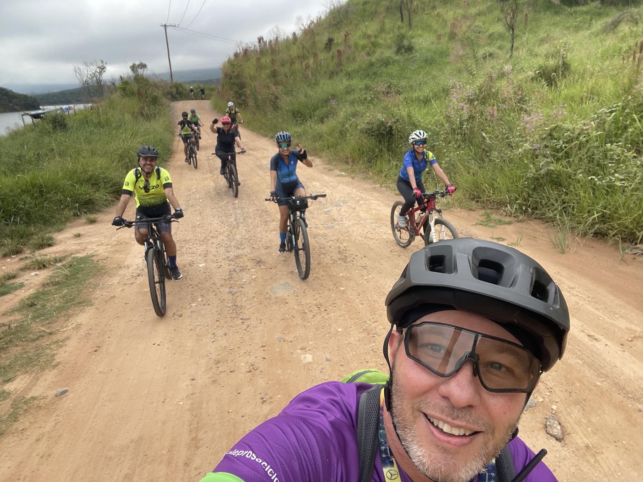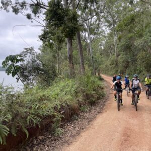 Saindo do Restaurante Lambari, o pedal segue por estradas de terra batida, com subidas moderadas, trechos sombreados e descidas empolgantes, em um clima de aventura acessível e prazeroso.